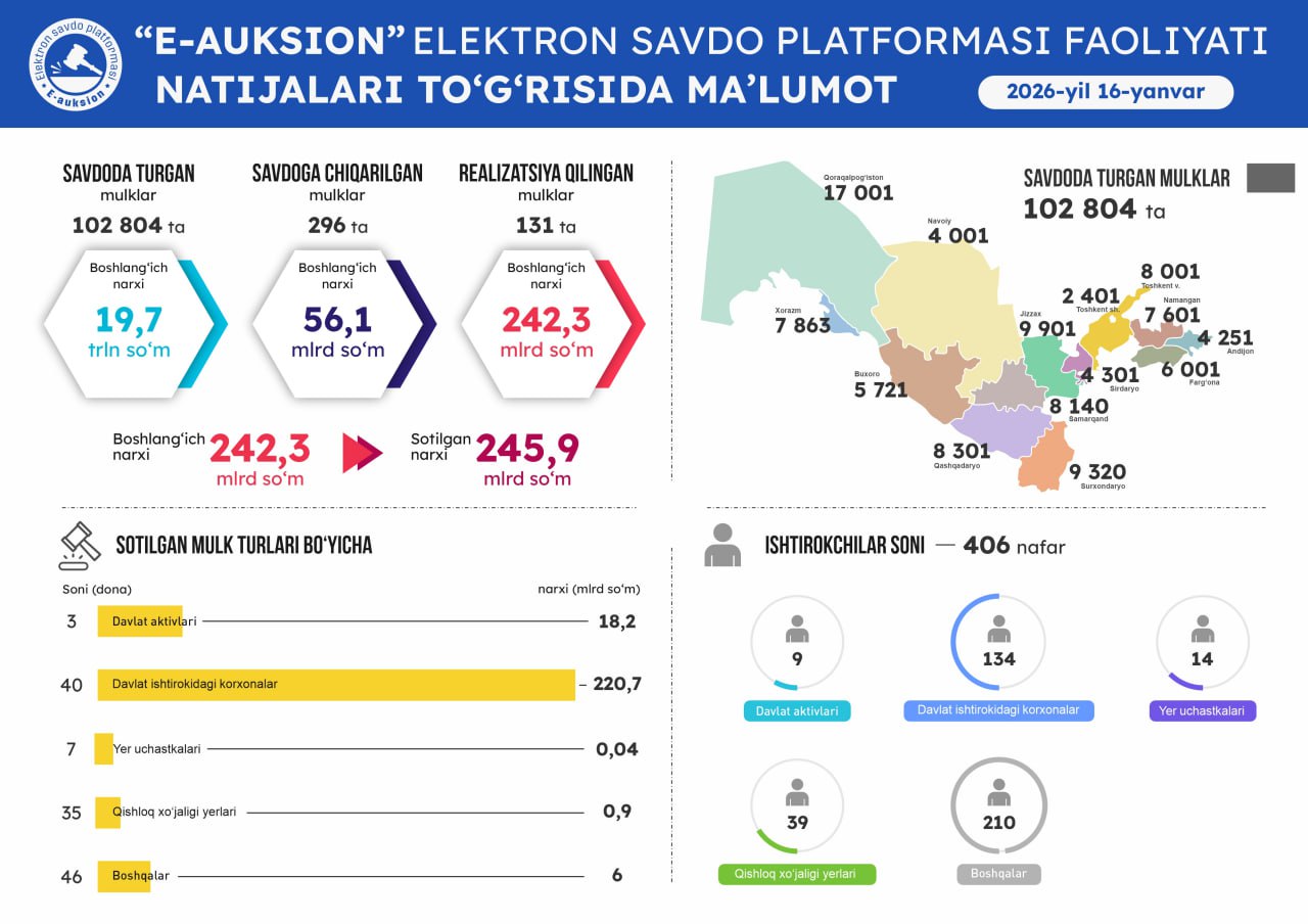 296 ta lot onlayn auksion savdolariga chiqarildi. Shuningdek, boshlang'ich narxi 242,3 mlrd so'm bo'lgan 131 ta lot 245,9 mlrd so‘mga realizatsiya qilindi.