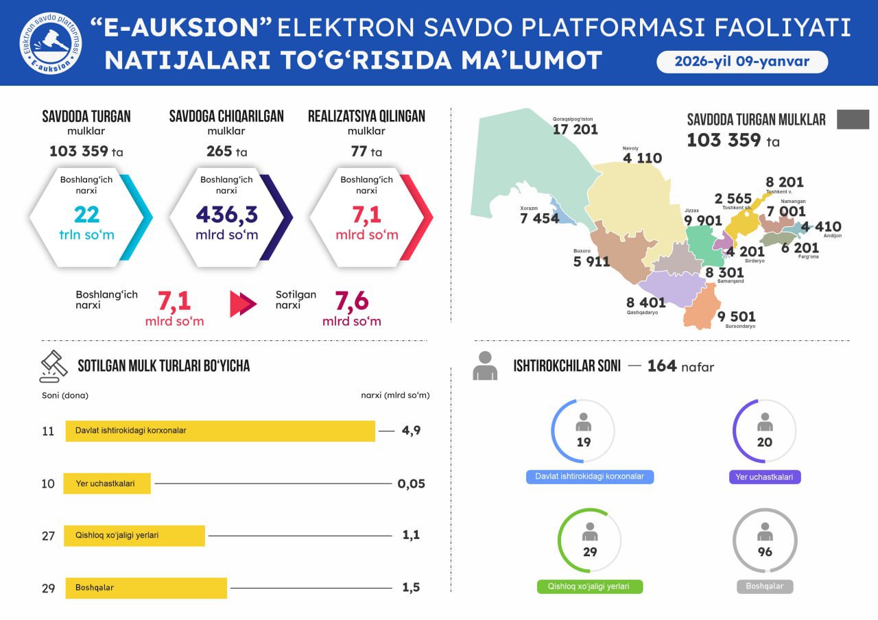 265 ta lot onlayn auksion savdolariga chiqarildi. Shuningdek, boshlang'ich narxi 7,1 mlrd so'm bo'lgan 77 ta lot 7,6 mlrd so‘mga realizatsiya qilindi.