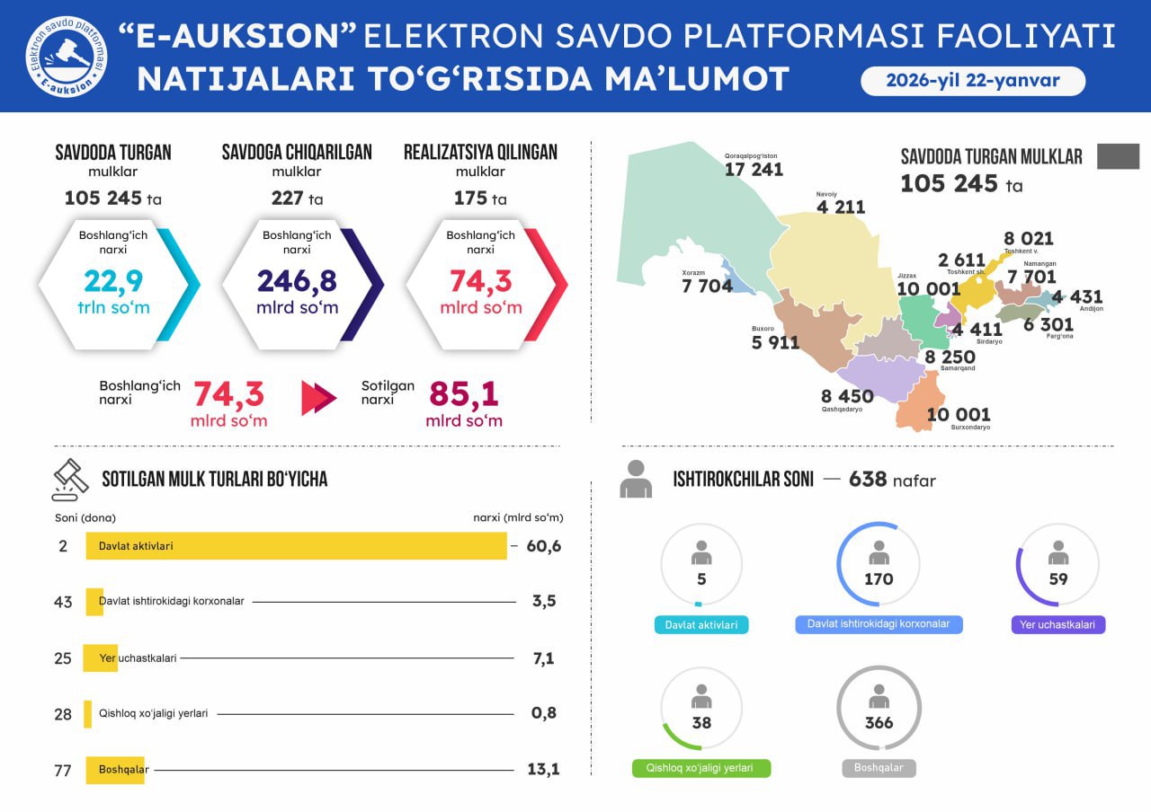 E-auksion.uz orqali shaffof auksionda ishtirok eting, mulk va yer uchastkalarini…