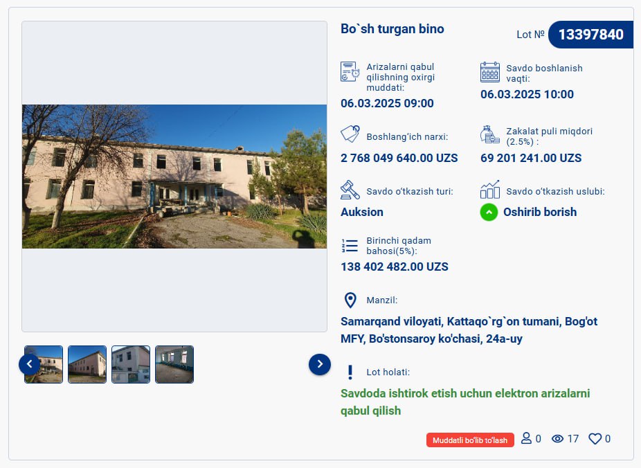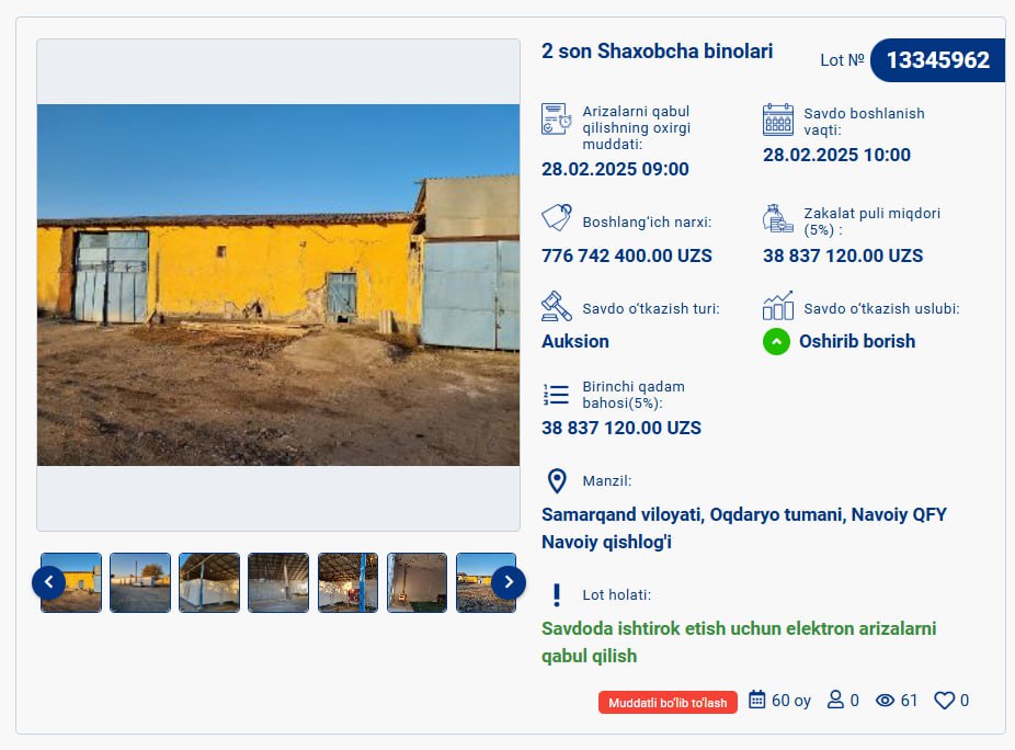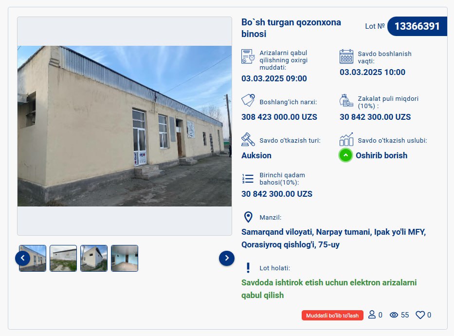 Hududingizda joylashgan bino va inshоoatlarni e-auksion.uz platformasi orqali xa…