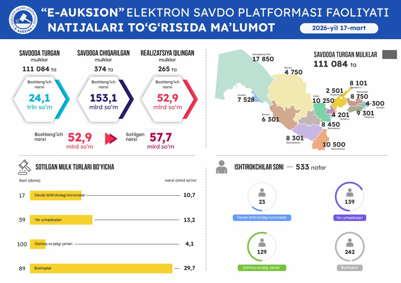 374 ta lot onlayn auksion savdolariga chiqarildi. Shuningdek, boshlang'ich narxi 52,9 mlrd so'm bo'lgan 265 ta lot 57,7 mlrd so‘mga realizatsiya qilindi.