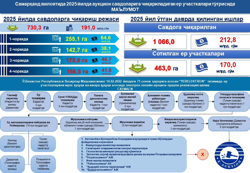 Самарқанд вилоятида 2025 йилда аукцион савдоларига чиқариладиган ер участкалари тўғрисида